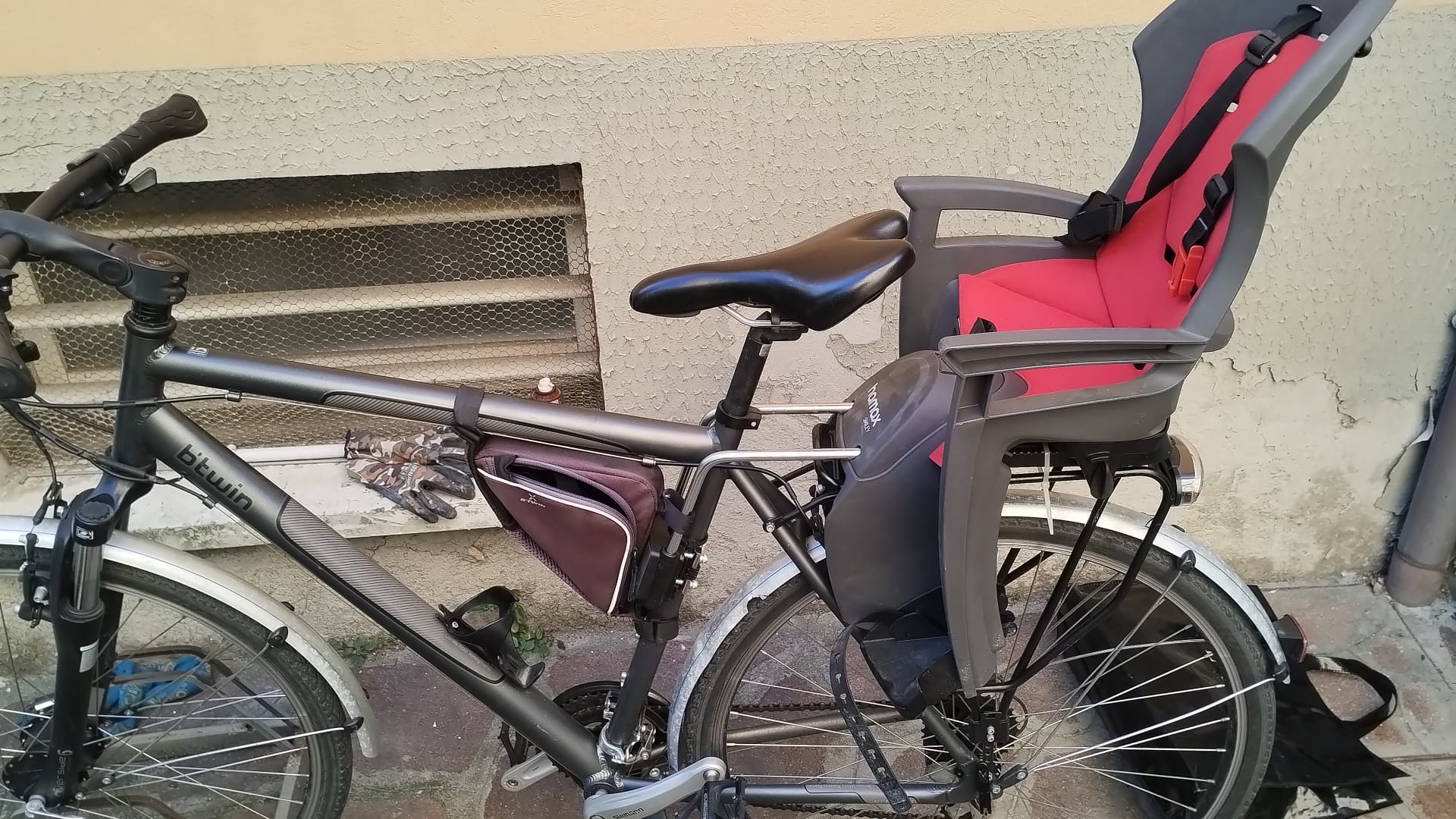 descrizione / segni particolari: MountainBike da Città con sospensione anteriore; seggiolino Hamax per bimbo <18kg; porta oggetti verde e giallo; Pedali metallo, rapporti shimano 21 marce; portapacchi